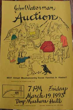 These are some of the old Waterman Auction posters. The audacious auction is described on one of the other club pages. The really colorful posters, not among these, from the outrageous poster coloring parties, are in private collections. Most of the designs were made by Robert Grunditz, a famous Fairbanks artist sort. The faces on one of the posters are local and visiting climber sorts. If anyone remembers the last name of Brad or Brandon from Colorado, and the name of his girl friend, let us know.